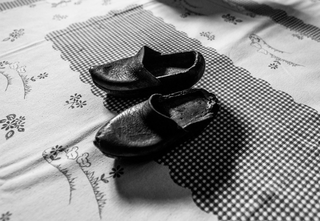 Le sue prime scarpe, le “palote”, zoccoli di legno d’acero e cuoio, testimonianza di un’epoca dove tutto era fatto a mano, con l’ingegno della necessità.